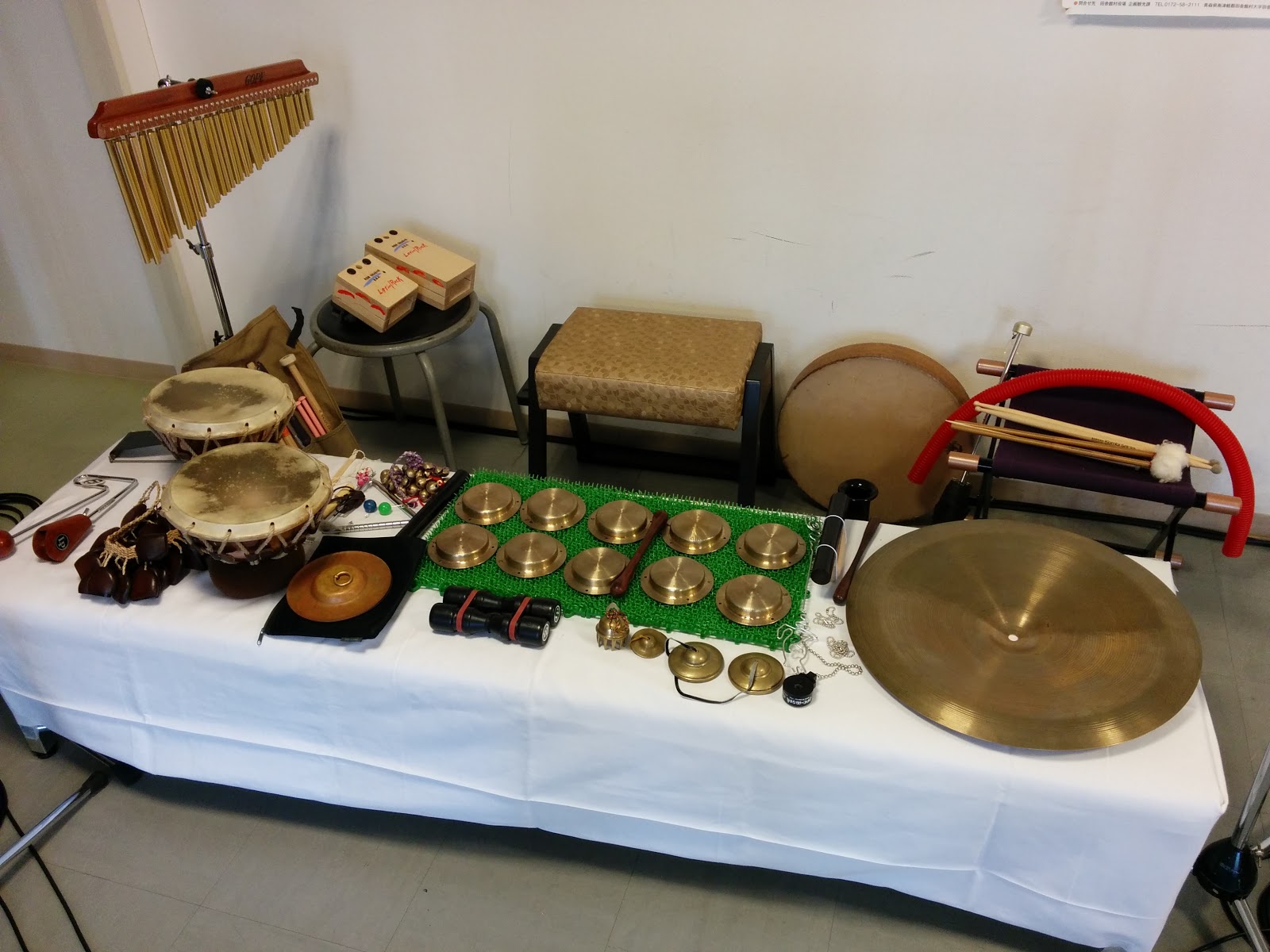 | 今回はこんなセッティング。 コンガ、ハンドソニック、各種シンバル、ウィンドチャイム、テーブルで小物類。 |